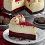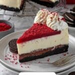 This decadent Red Velvet Cheesecake features a rich chocolate cookie crust, a creamy red velvet cheesecake filling, and a smooth cream cheese frosting. Baked in a water bath for the perfect texture and chilled to set, this dessert is ideal for any special occasion or holiday treat.