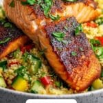 This Salmon and Couscous Bowl is a nutritious and flavorful meal perfect for a quick weeknight dinner. Tender, pan-seared salmon fillets seasoned with smoked paprika and garlic powder are served over fluffy couscous, accompanied by fresh cucumber, cherry tomatoes, red onion, and parsley. A tangy lemon-Dijon dressing ties all the flavors together for a wholesome, balanced dish.