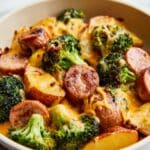A flavorful and hearty Sausage Potato Broccoli Skillet that combines caramelized smoked sausage, tender baby potatoes, and fresh broccoli florets seasoned with Cajun spices and topped with melted cheddar cheese. This one-pan meal is perfect for a comforting dinner and easy to prepare in under an hour.