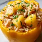 Delight in these vibrant Teriyaki Pineapple Chicken & Rice Stuffed Peppers, featuring tender chicken breast sautéed in a flavorful homemade teriyaki sauce with sweet pineapple chunks and rice, all baked inside colorful bell peppers. This dish offers a perfect balance of savory, sweet, and tangy flavors, making it a wholesome and visually appealing dinner option.