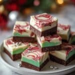 - Layer the fudge: Pour the red fudge into the prepared pan and spread evenly. Next, layer the plain fudge over the red layer, followed by the green fudge on top. Use a knife to gently swirl the layers together creating a marbled effect.